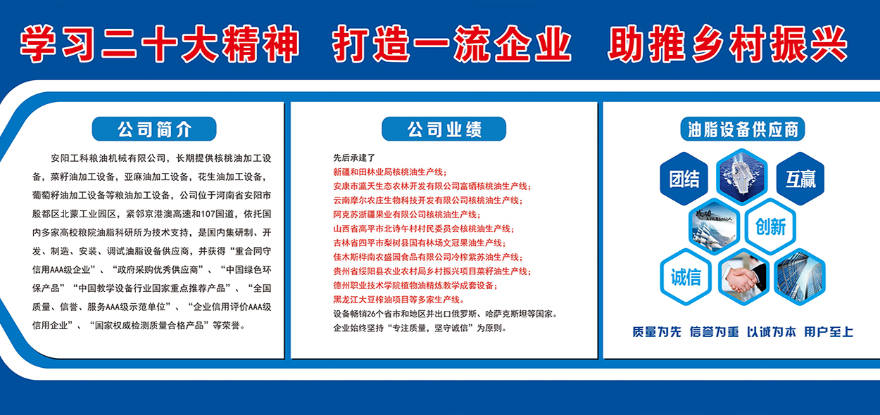 安陽工科糧油機械有限公司,長期提供核桃油加工設備,茶籽油加工設備,菜籽油加工設備,亞麻油加工設備,花生油加工設備,葡萄籽油加工設備等糧油加工設備,公司位于河南省安陽市殷都區北蒙工業園區,緊鄰京港澳高速和107國道,是國內集研制、開發、制造、安裝、調試油脂設備供應商。先后承建了新疆和田林業局核桃油生產線,安康市瀛天生態農林開發有限公司富硒核桃油生產線,云南摩爾農莊生物科技開發有限公司核桃油生產線,阿克蘇浙疆果業有限公司核桃油生產線,山西省高平市北詩午村村民委員會核桃油生產線,吉林省四平市梨樹縣國有林場文冠果油生產線,,佳木斯樺南農盛園食品有限公司冷榨紫蘇油...